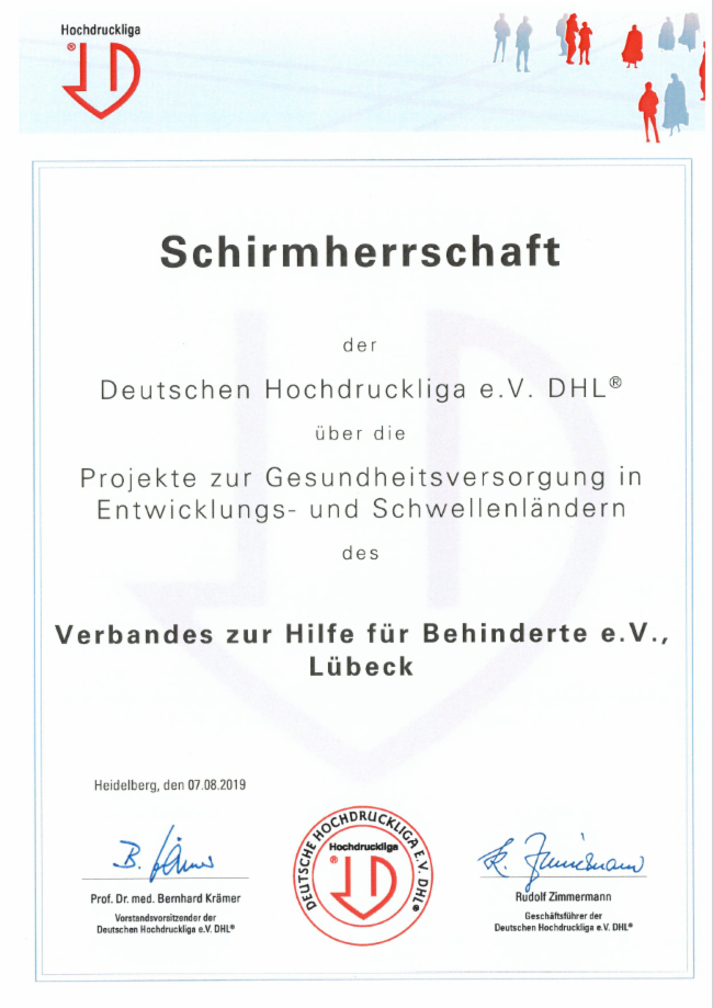 Am 7. August 2019 hat die Deutsche Hochdruckliga e. V. (DHL) über unsere Projekte zur Gesundheitsversorgung in Entwicklungsländern- und Schwellenländern die Schirmherrschaft übernommen.