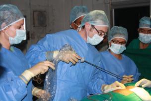 Die Chirurgen Prof Dr. Bürk und Dr. Nehara Begum beim Einbringen der Instrumente bei der ersten laparoskopischen Spendernephrektomie in Bangladesch.